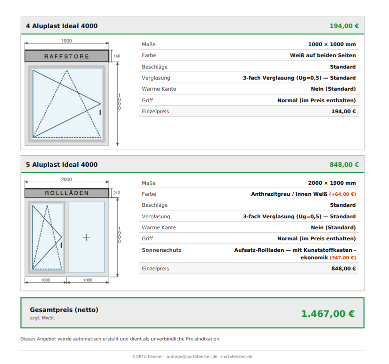 Öffnen Sie unseren Konfigurator und stellen Sie Ihre Fenster, Rollläden und Zubehör selbst zusammen. Den Preis sehen Sie sofort — und zu jedem Fenster erstellen wir eine technische Zeichnung. Am Ende geben Sie Ihre E-Mail-Adresse und Ihren Namen an. Wir senden Ihnen die komplette Zusammenfassung mit Zeichnungen per E-Mail.