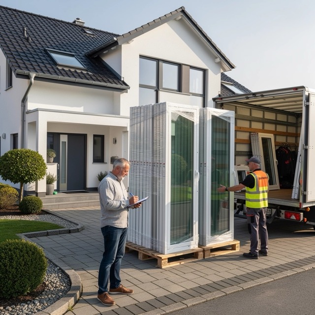 Fenster werden vor der Montage nicht ausgepackt — Sie prüfen den Zustand der Verpackung und die Vollständigkeit der Lieferung. Anschließend unterschreiben Sie das Abnahmeprotokoll. Falls eine Verpackung beschädigt ist, vermerken Sie das im Protokoll vor der Unterschrift — wir fotografieren den Schaden vor Ort.